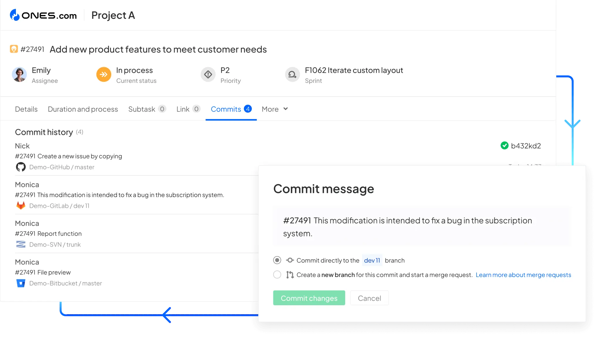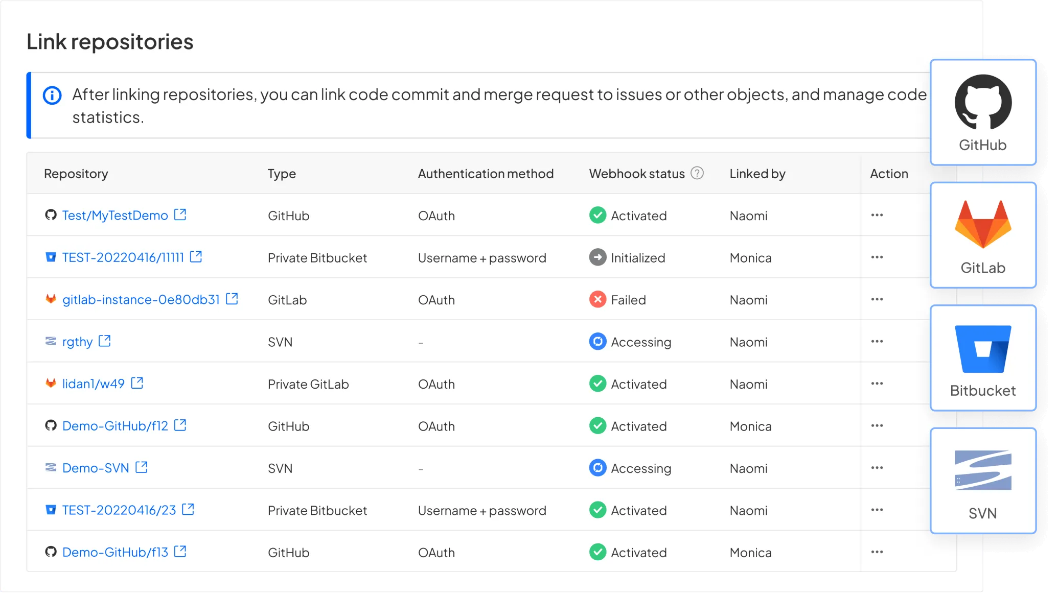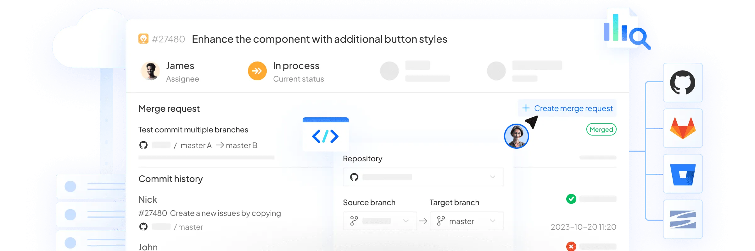 - Enhanced traceability with Smart CommitsReal-time synchronization of commit, merge, and branch information to issue details.