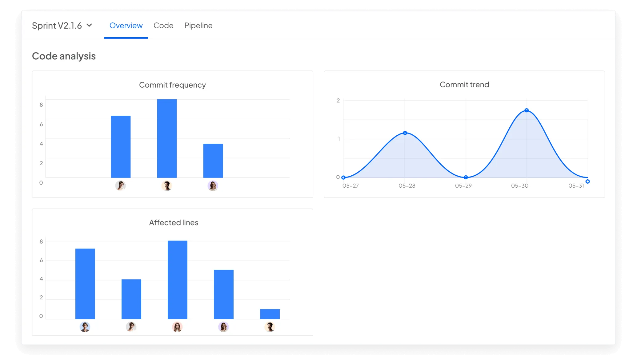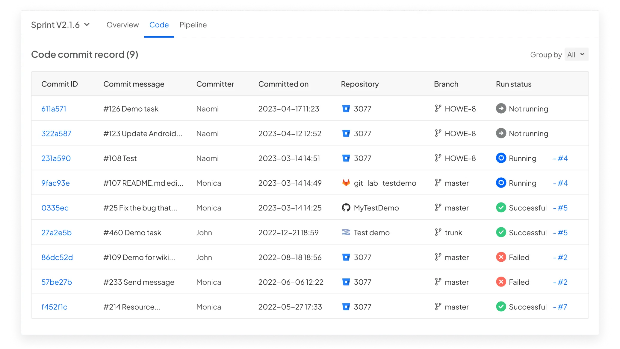 Sprint overview supports collecting and managing code commits in the current sprint, which assists sprint owners to evaluate efforts in the development process.