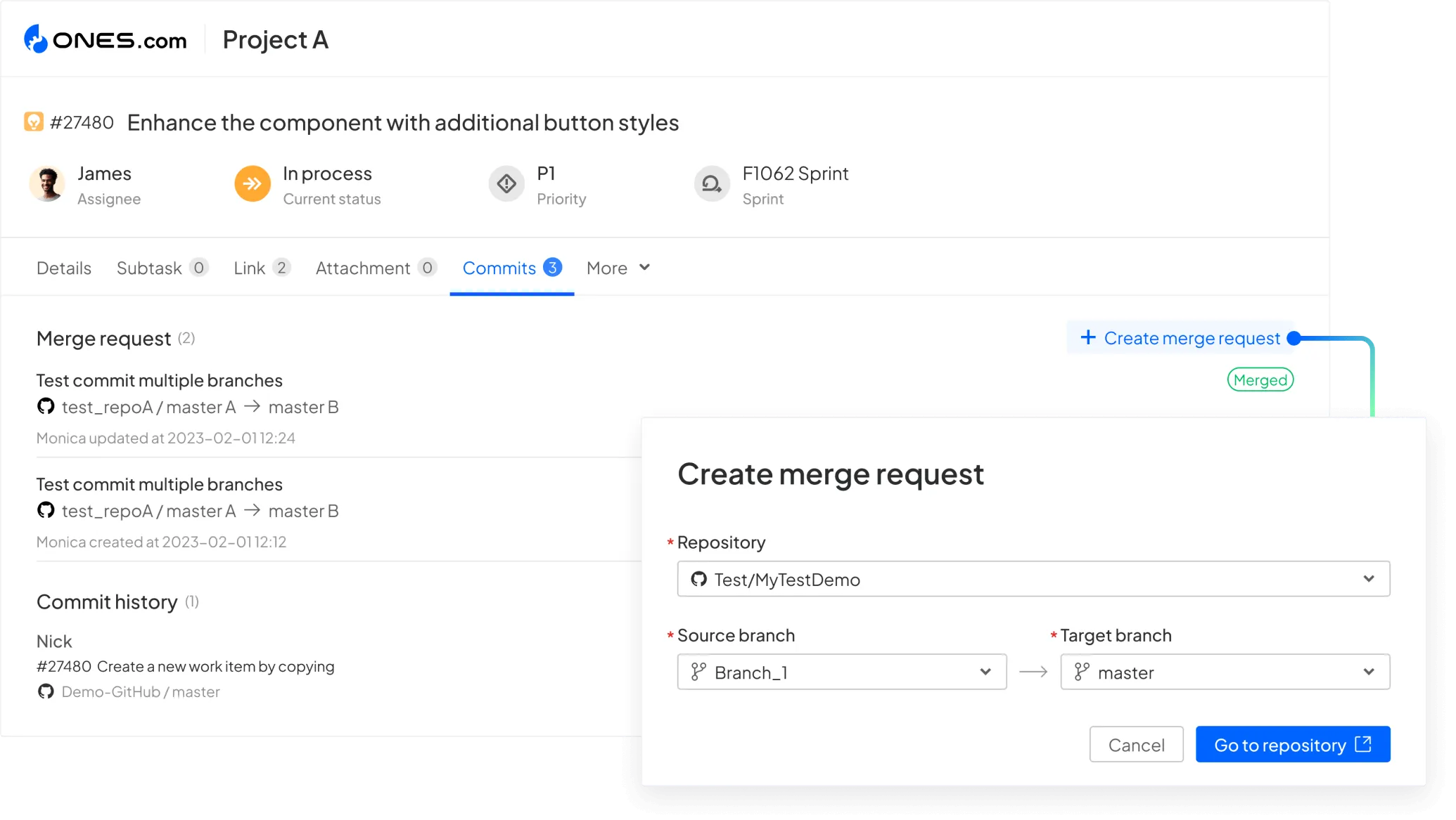 - Create a branch and merge request on ONES.comCreate a branch and merge request quickly and easily with ONES.com and without switching platforms.